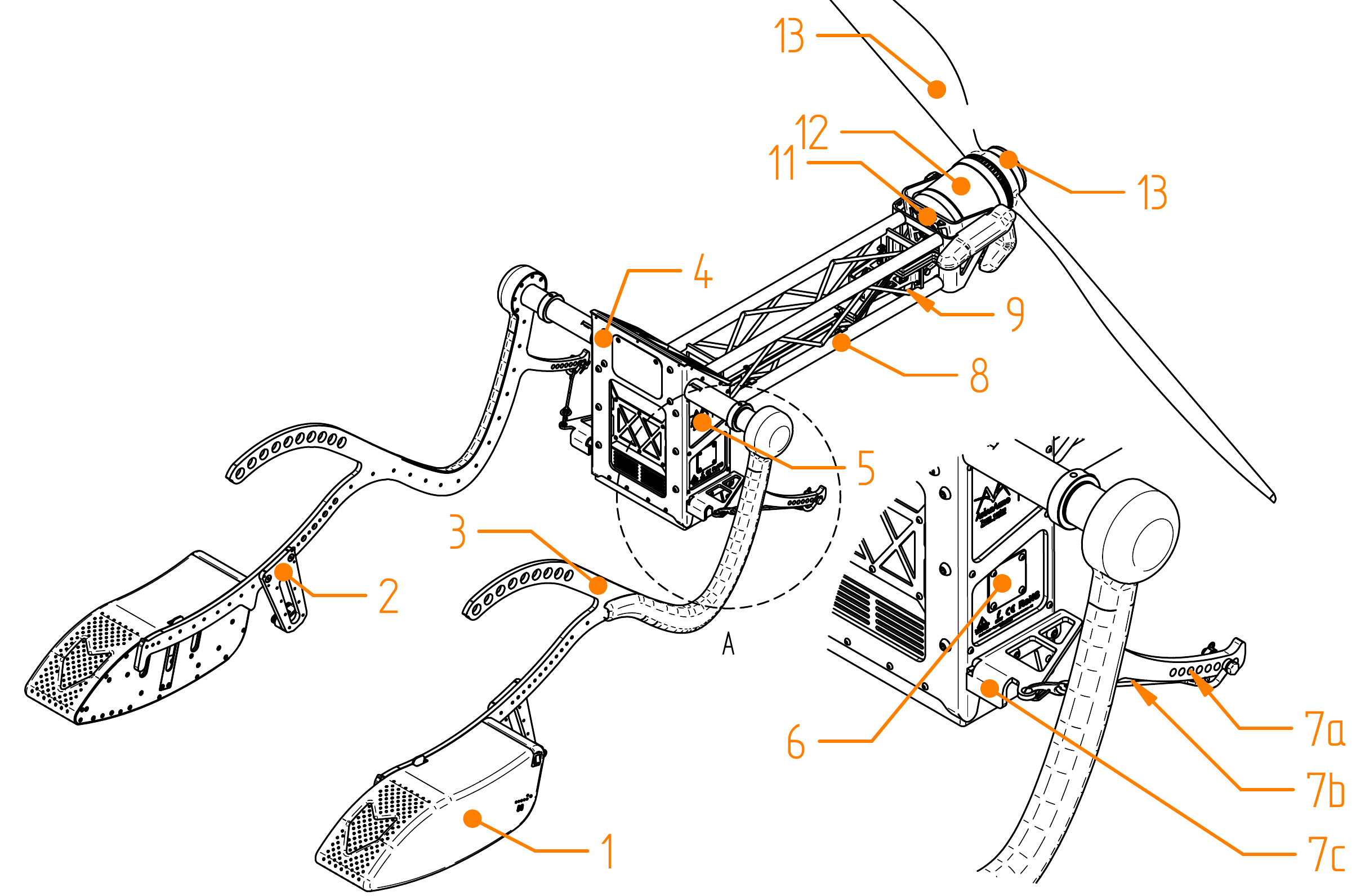 Verbindung zwischen Antrieb und Schubstange ➂. Beinhaltet die elektronischen Komponenten (z.B. Flightcontroller)