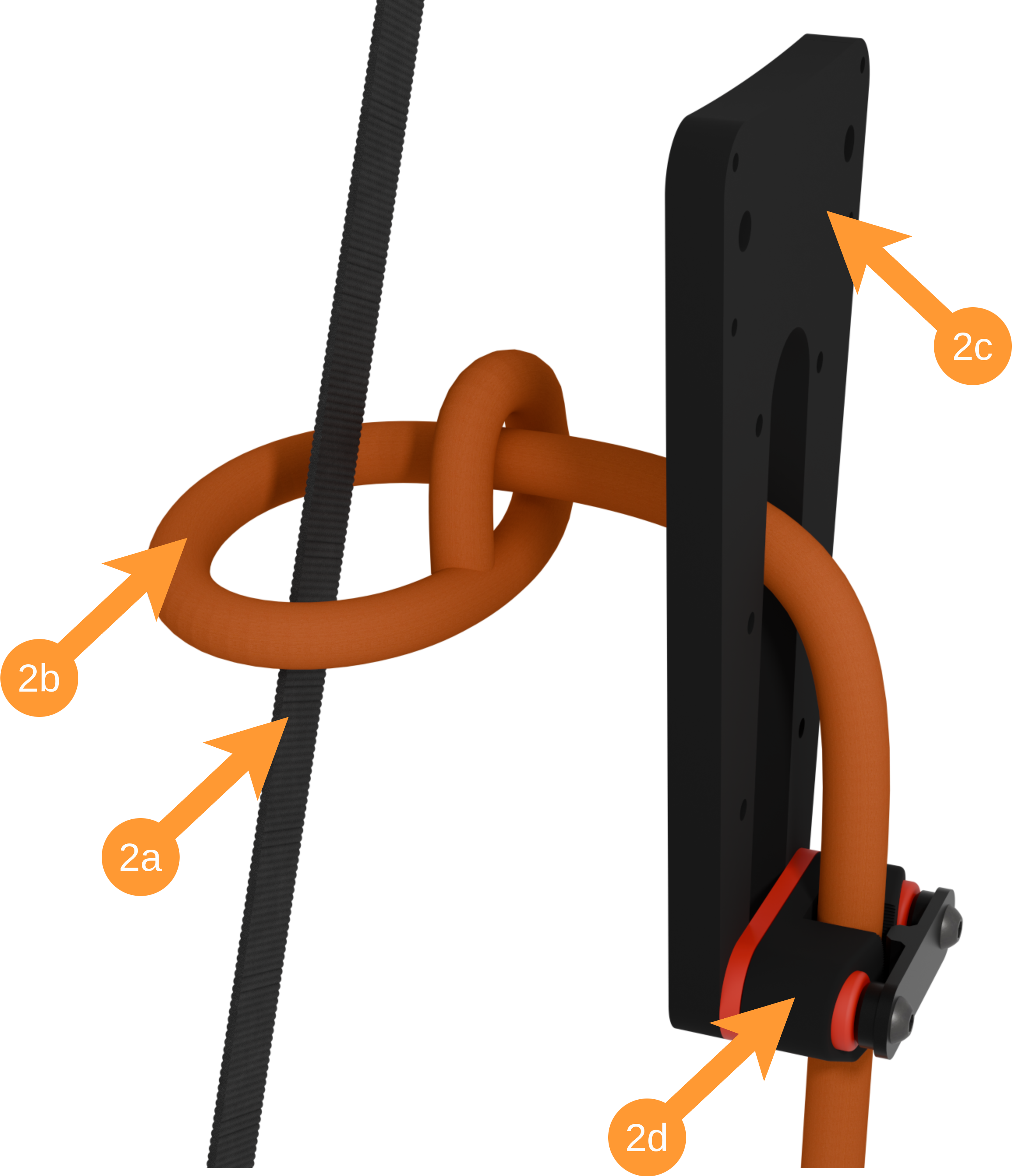 Um die Dämpfung ➁ einzuhängen, lege das Verbindungsseil ⓐ um die Hauptaufhängung ⓑ deines Gurtzeugs und führe dies anschließend durch die Seilschlaufe und den Schlitz des Dämpfungselements ⓒ der Schubstange ➂.